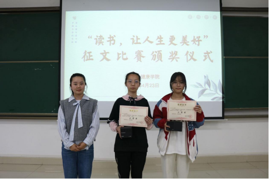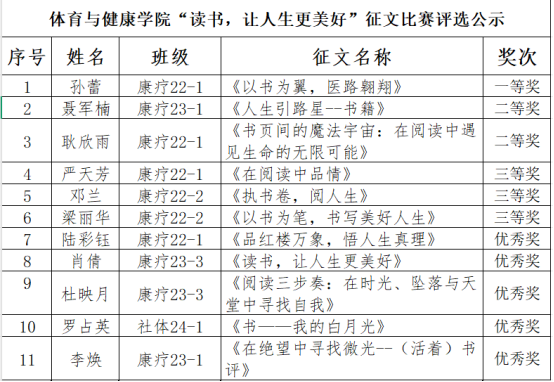 此前,“读书,让人生更美好”征文比赛活动同样在校园内掀起了一股写作热潮。同学们纷纷投稿讲述自己与书结缘、读书改变自我的故事。征文比赛面向全院员工,在活动时间内共收到征文60余篇,通过评比,康疗22-1班孙蕾《以书为翼 医路翱翔》获得一等奖;康疗23-1聂军楠《人生引路星-书籍》、康疗22-1耿欣雨《书页间的魔法宇宙:在阅读中遇见生命的无限可能》获得二等奖;康疗22-1严天芳《在阅读中品情》、康疗22-2邓兰《执书卷 阅人生》、康疗22-2梁丽华《以书为笔 书写美好人生》荣获三等奖;康疗22-1陆彩钰《品红楼万象 悟人生真理》、社体24-1罗占英《书—我的白月光》等获得优秀奖。
