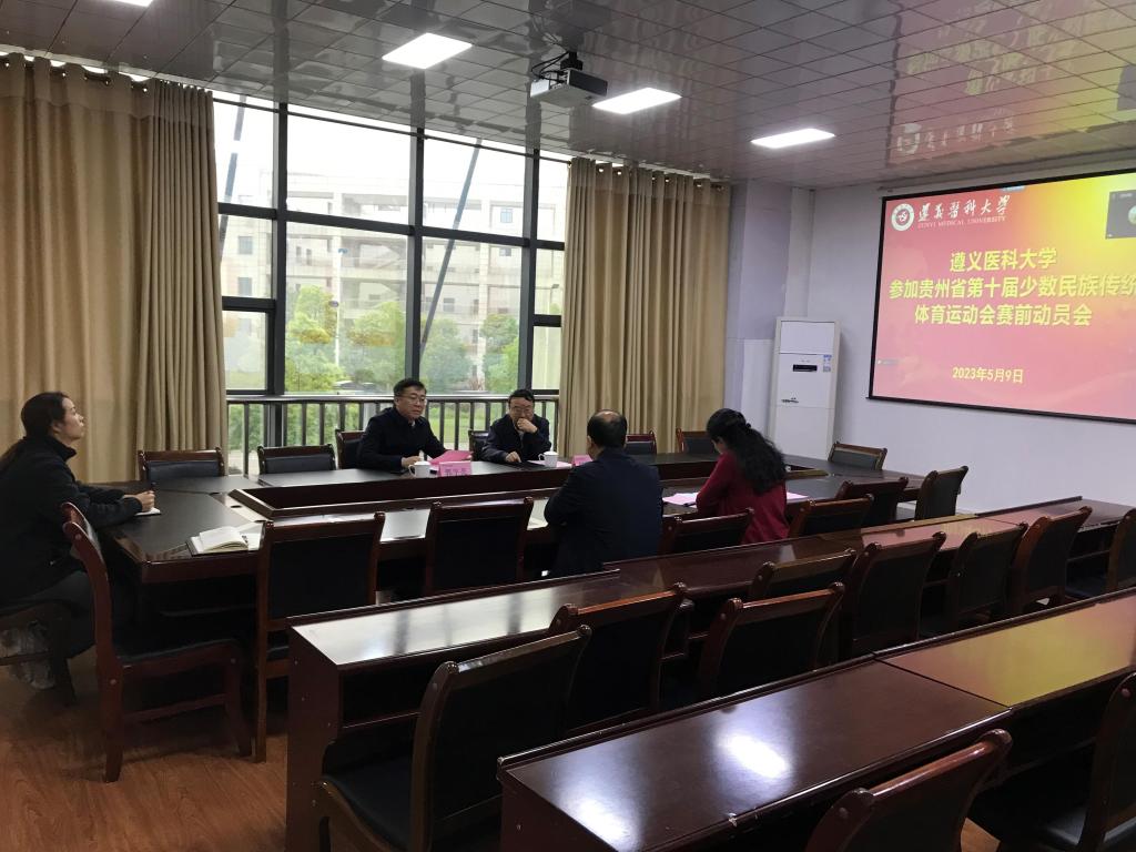 5月10日下午,tyc522cc太阳成集团参加贵州省第十届少数民族传统运动会赛前动员会在tyc522cc太阳成集团会议室以视频连线形式召开。公司党委委员、副董事长赵继锋,公司党委委员、组织部长、统战部长郭宇亮,珠海校区党委副书记李荣远,体育与健康公司党委书记杜娟,珠海校区参赛项目负责人、教练员和运动员出席会议。体育与健康公司党委副书记、经理汪伟主持会议。