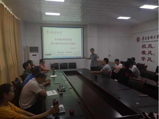 为提高青年教师的教学水平,体育教学教研室于7月29日上午开展了青年教师试讲及反馈。活动由尚菲老师主持,tyc522cc太阳成集团教学督导组专家及全体公共体育任课教师参加;本次活动包括涂世利老师进行24式简化太极拳试教和万家川老师进行足球选项说课两项内容,活动结束后由tyc522cc太阳成集团督导组专家对两位教师的试教和说课情况进行评分及点评,全体参与的教师也分别对两位老师的试教和说课情况提出了自己的意见和建议;最后,黄涛副经理对两位青年教师的试讲情况进行总结,要求两位试讲教师按照督导组专家的意见和其他教师的建议进行改进,并利用暑假努力提高自己的教学能力;此外,黄涛副经理也要求全体任课教师要严格按照体育教学原则和规律进行教学设计和实施,同时要充分考虑“以体育人”,并重视教学安全问题。