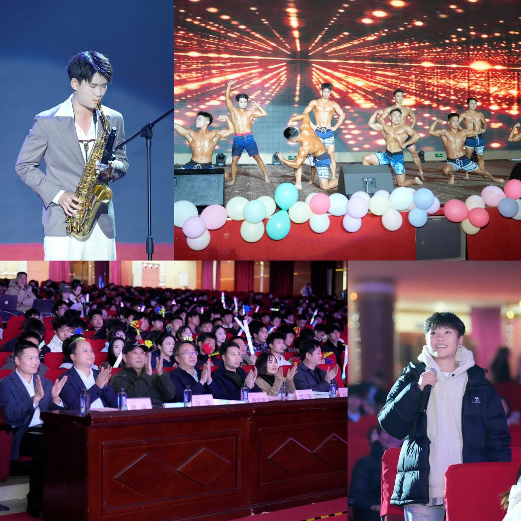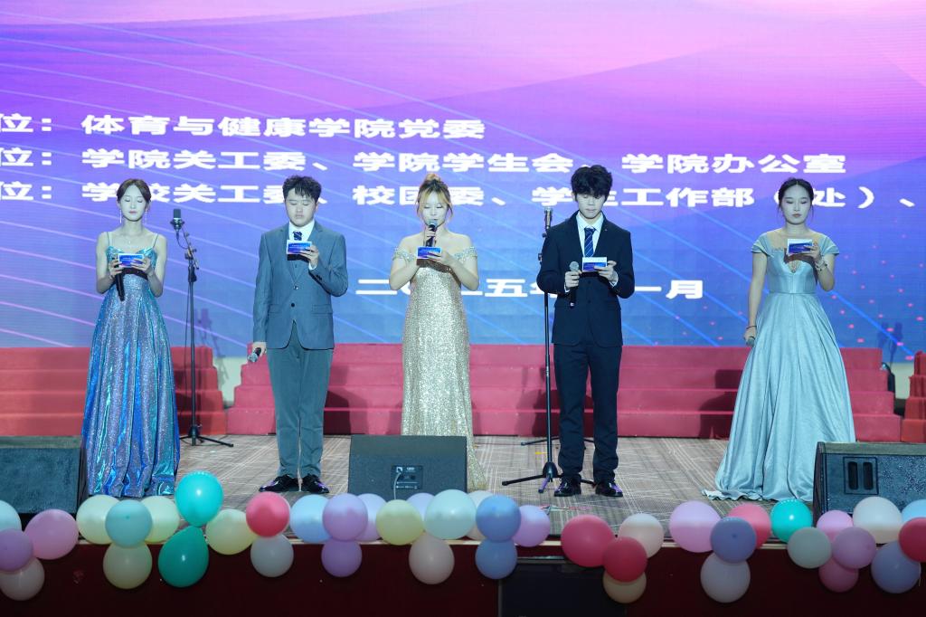 本次晚会分为“跃·启新程”“动·聚星光”“健·行未来”三个篇章。第一篇章中,五位主持人以活力开场点燃氛围,歌曲《同心·同梦·同首歌》、舞蹈《Abracadabra》与朗诵《体健之光,青春之华》,将青春朝气与公司文化深度融合。第二篇章聚焦榜样引领,由郭宇亮等领导为获得优秀员工干部、创业创新标兵、学习优秀奖等同学颁奖;本篇章中舞蹈《晨曦玫瑰·踏乐欢舞》,幕布剧《成长之路·我记得》与现场游戏“听歌识曲”互动环节,让温情与活力交织,引发全场师生热烈参与。第三篇章中,舞台剧《大好河山 寸土不让》厚植家国情怀,社会体育指导与管理专业《奔跑的青春向太阳》、运动康复团队《肌情燃烧,生命因运动精彩》展现专业魅力,“团小兔”抽奖环节与《谁杀死了周日》时间管理剧,将欢乐与启示传递给全体师生。