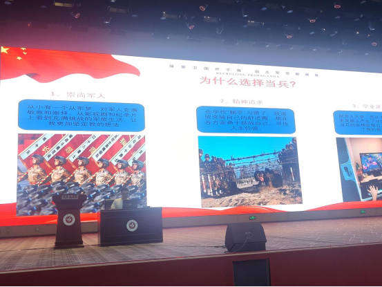 22级潘鹏程同学从军旅初心、军营淬炼、政策解读、报名流程四个方面分享了他的军旅经历,鼓励大家积极参军,报效祖国。